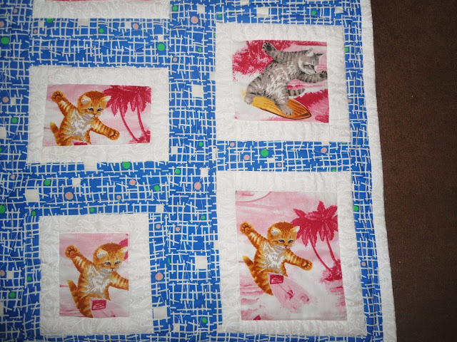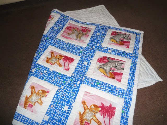I then made each of the smaller cat and white blocks larger by first adding a side border of the blue hemmingway print to make all the blocks in each column more or less equal in width (did I mention that I had no plan for this quilt...) The blue hemmingway fabric was then used for the sashing and the quilt was bound with the remains of the white fabric.