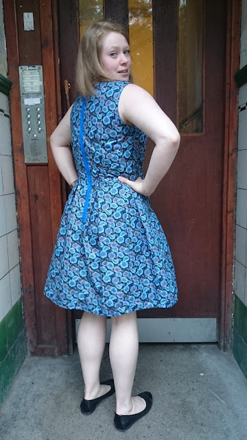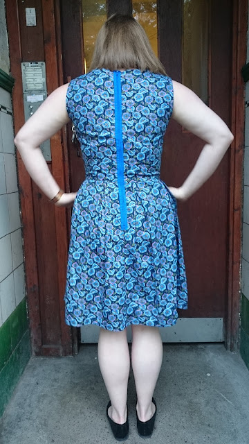 The fabric I purchased for this new vision of the dress was a dark blue with gold outlined flowers. I saw it and instantly knew that this would be the perfect fabric. It is a kind of hybrid between a lawn and a poplin. I cant decide which! It came in at around £6/m too so - bargain! I couldn't find a zip that I really wanted but I think my second choice works just fine. I had to stitch over the ends of the zipper as it was open ended.
